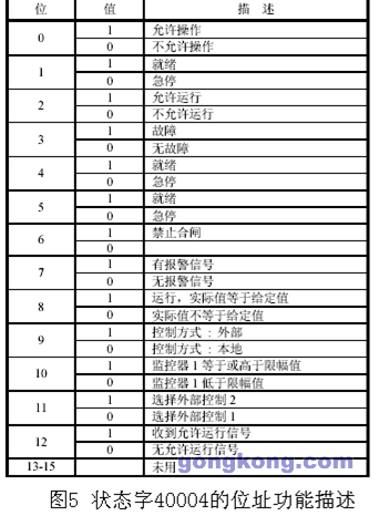 同時(shí),通過(guò)對(duì)存儲(chǔ)寄存器40004(狀態(tài)字)讀取,可獲得變頻器的運(yùn)行狀態(tài)等信息,然后通過(guò)觸摸屏顯示界面,操作人員可以直觀地了解變頻器運(yùn)行信息.40004的位址內(nèi)容如圖5所示.