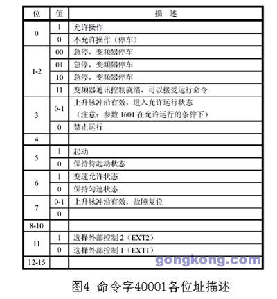 TVF2000的菜單參數(shù)被一一影射為MODBUS協(xié)議的寄存器,MODBUS通訊對(duì)各寄存器的操作,即實(shí)現(xiàn)了對(duì)TVF2000中與寄存器對(duì)應(yīng)的菜單參數(shù)的操作.對(duì)應(yīng)的命令寄存器為40001,其中每一位控制的具體內(nèi)容如圖4所示.