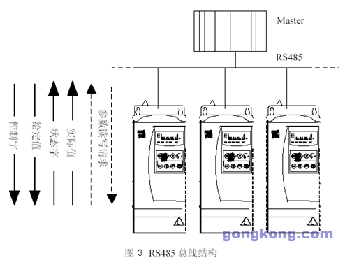 時(shí)代TVF2000系列變頻器可通過(guò)串行RS485總線與外部PLC控制系統(tǒng)進(jìn)行通訊,通訊協(xié)議為MODBUS的RTU形式,其控制命令和給定頻率全 部來(lái)自MODBUS通訊,其RS485總線結(jié)構(gòu)如圖3所示。TVF2000變頻器的寄存器40001為控制字,寄存器40002為給定值1,寄存器 40004為狀態(tài)字,寄存器40005為實(shí)際值。其相關(guān)參數(shù)設(shè)置如下: