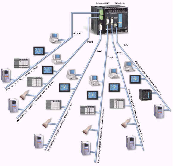 Bs-PLC之5個通訊端口可同時連結各種智能型外圍,界面則有USB、RS232、RS485、以太網(wǎng)絡(Ethernet)可供選擇,除可選用永宏標準通訊協(xié)議或Modbus通訊協(xié)議或透過FATEK Communication Server通訊伺服器來通訊外,尚可利用CLINK通訊便利指令,自行定義通訊協(xié)議主動或被動地與任何智能型外圍聯(lián)機。