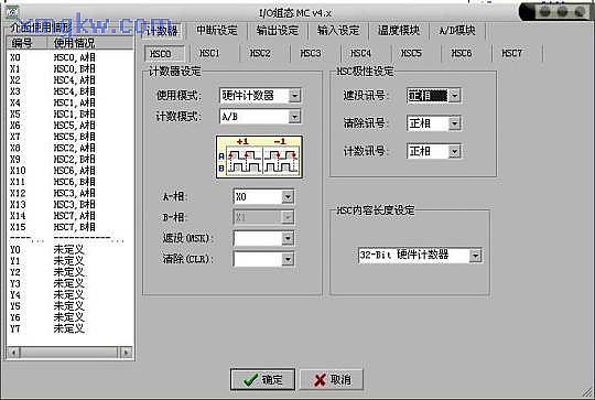 (1) 主機(jī)具備4個(gè)200kHz的硬件高速計(jì)數(shù)器(HHSC)和4個(gè)頻率總和為5kHz的軟件高速計(jì)數(shù)器(SHSC),無(wú)需另加高速計(jì)數(shù)模塊即可滿(mǎn)足系統(tǒng)需求。軟件高速計(jì)數(shù)器支持U/D,P/R,A/B三種計(jì)數(shù)模式,硬件高速計(jì)數(shù)器更是支持U/D*2, P/R*2, A/B*2,A/B*3, A/B*4,共計(jì)8種計(jì)數(shù)模式。