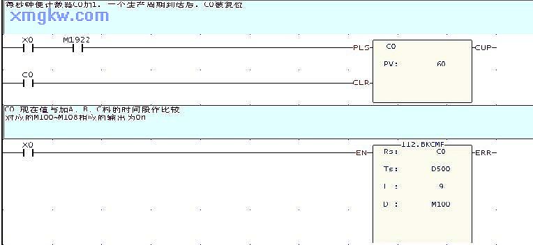 ? 所謂絕對凸輪控制,是指計數(shù)器 C現(xiàn)在值在設(shè)置的一段絕對時間段內(nèi),對應(yīng)輸出裝置會 ON,多個 M 裝置可能同時為 ON。本例中, C0現(xiàn)在值與 9段設(shè)置絕對時間段( D500~D517)進(jìn)行比較,在這些設(shè)置時間段內(nèi),對應(yīng)的 M100~M108 中的裝置狀態(tài)輸出為 ON。 z在BKCMP指令被執(zhí)行前,也可用 MOV指令預(yù)先將各設(shè)置值寫入到 D500~D517中。C0當(dāng)前值所屬范圍 | 輸出裝置 |