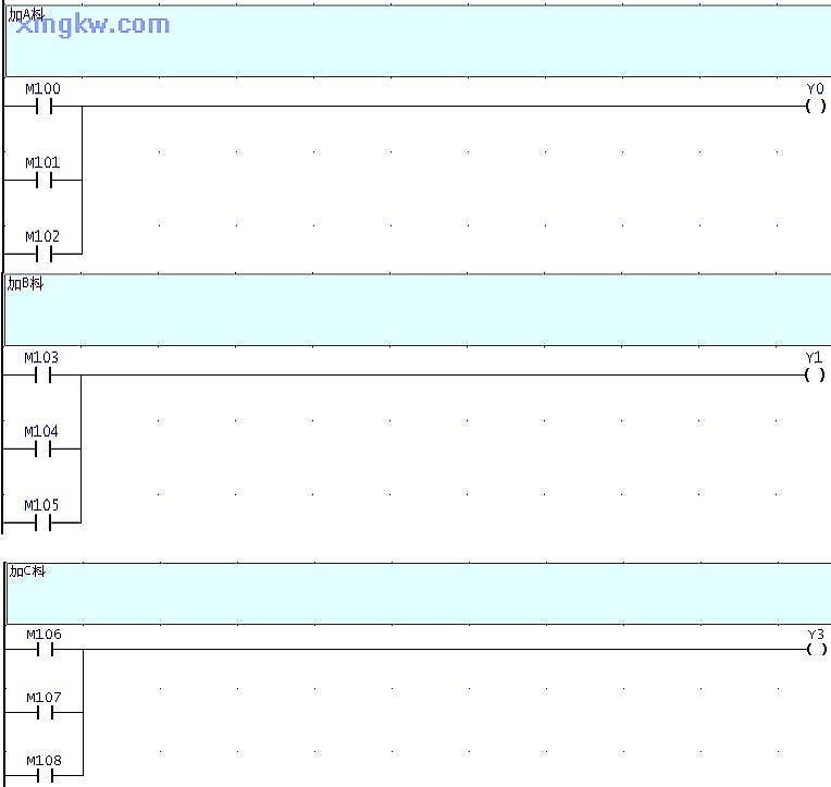 【控制程序】首先將各種原料加入的下限、上限時間設(shè)定在緩存器表格中,如下圖: