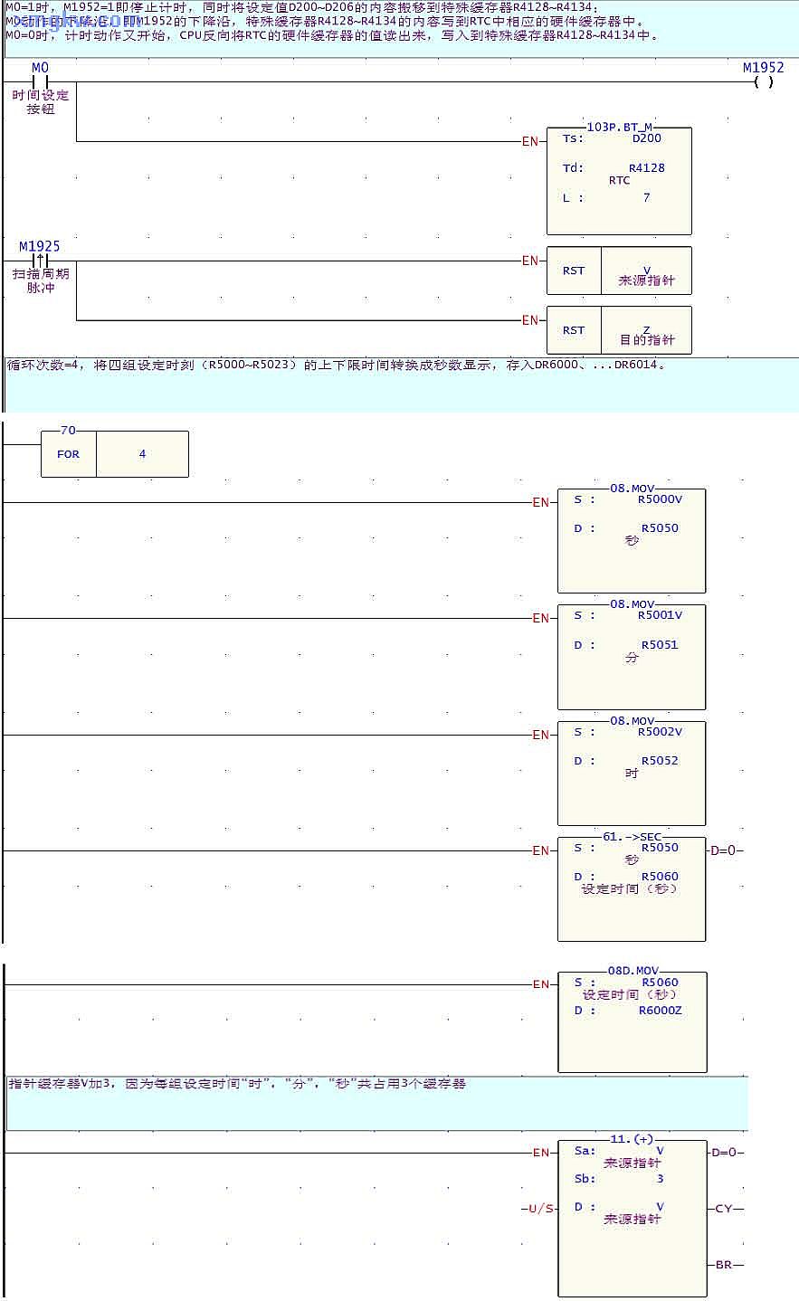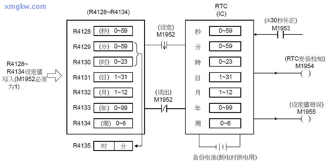 在M1952 由1→ 0 瞬間將 R4128~ R4134的設(shè)定值寫到 RTC中相對應(yīng)的硬件緩存器中。在M1952回到0 后計時動作開始,同時每次掃描 CPU 將反向地將 RTC中的時間值讀出,寫到 R4128~ R4134 去。