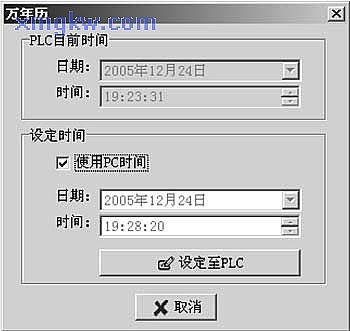 (2)時間的設(shè)定,也可以在 WinProladder界面中方便實現(xiàn):點(diǎn)選菜單“PLC”?“設(shè)定”?“萬年歷”,即可出現(xiàn)下列窗口: