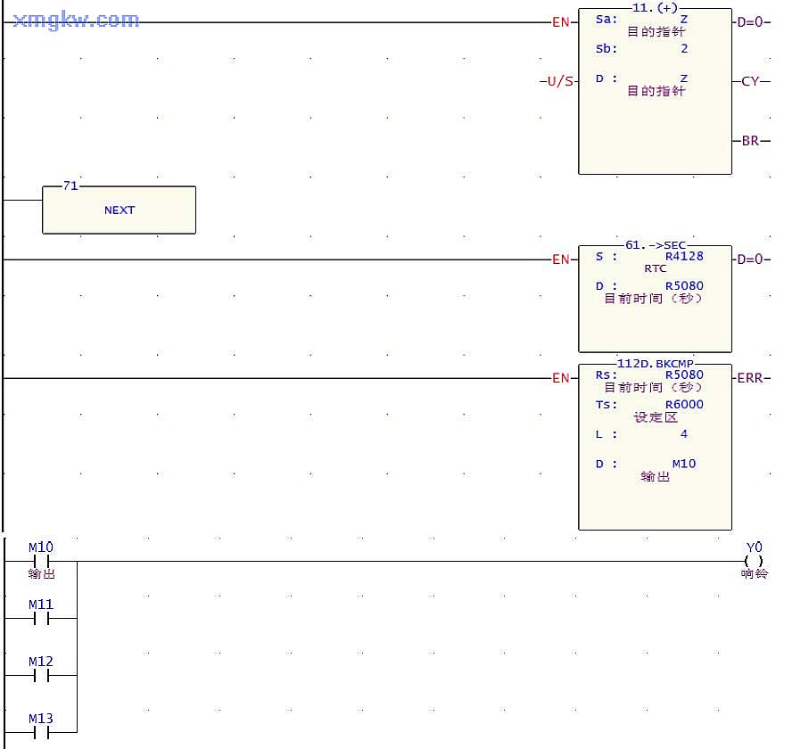 (3)將每次響鈴的上下限時刻轉(zhuǎn)換為秒,再結(jié)合 FUN112.BKCMP指令,即可實現(xiàn)一分鐘內(nèi)響鈴。