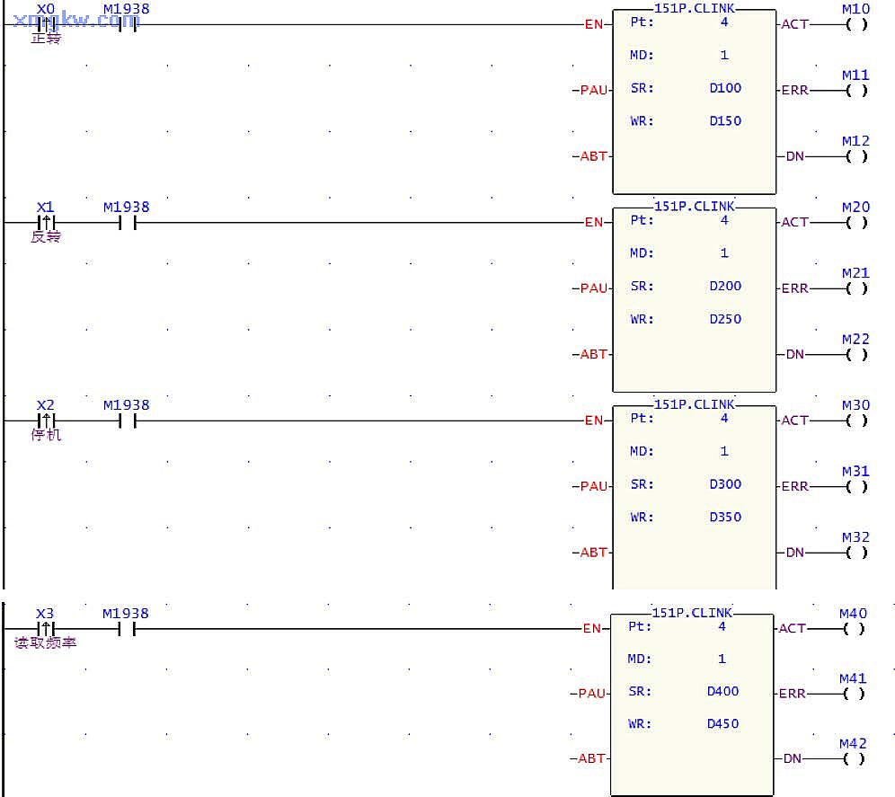 z通過按鈕X0,X1,X2控制變頻器的正轉(zhuǎn),反轉(zhuǎn),停機z按鈕X3讀取運行頻率z以自由協(xié)議方式通訊
