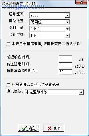 【PLC通訊參數(shù)設置】 點選菜單欄的“ PLC”?“設定” ?“Port4通訊參數(shù)”,通訊格式為 9600,E,8,1。如下圖所示: