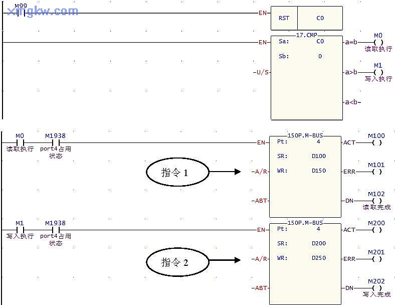 4. FUN150.M-BUS執(zhí)行狀態(tài)標(biāo)志有 “ACT”,“ERR”,“DN”。PLC一開始RUN就比較 C0是否等于 0,若C0=0,執(zhí)行讀取命令,當(dāng)讀取完成 “DN”輸出M102,使C0加1,又通過比較指令,當(dāng) C0=1時輸出M1,執(zhí)行 “寫入”指令,當(dāng)寫入完成時 “DN”輸出M202,使C0復(fù)位,而 C0=0時輸出 M0,如此循環(huán)不斷地控制兩個 FUN150.M-BUS指令的執(zhí)行。