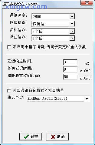 【通訊口參數(shù)設(shè)定】 PLC通訊口的參數(shù)需要與伺服驅(qū)動器一致。點選菜單欄的“ PLC” ?“設(shè)定” ?“Port4通訊參數(shù)”,將參數(shù)設(shè)為“9600baud,偶同位 ,數(shù)據(jù)位7,停止位 1”,接收異常偵測時間設(shè)為 500ms,采用 ModBus ASCII(Slave)通訊協(xié)議。