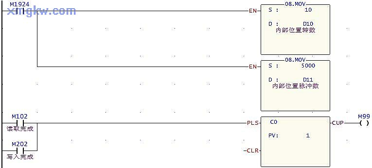1. PLC開機脈沖 M1924將內(nèi)部位置轉(zhuǎn)數(shù),內(nèi)部位置脈沖數(shù)存放到 D10、D11中。