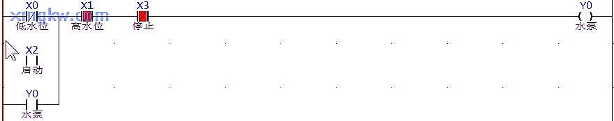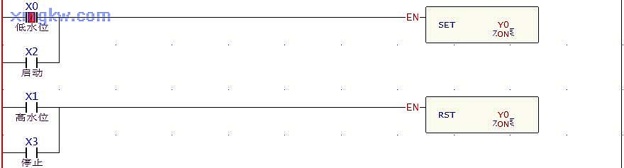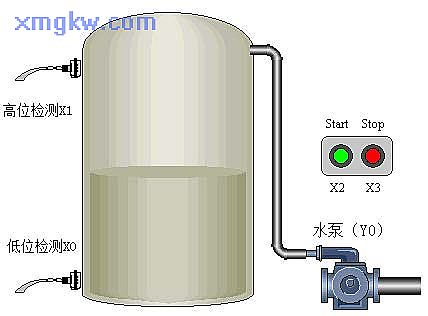 【控制要求】水塔儲水控制:當(dāng)按下 START按鈕 X2或塔內(nèi)儲水量低于低水位檢測光電 X0時,水泵( Y0)開始運行,抽水至水塔內(nèi);當(dāng)按下 STOP按鈕 X3或塔內(nèi)儲水量高于高水位檢測光電 X1時,水泵停止抽水工作。