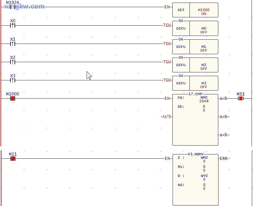 - 按下任何按鈕后,對應(yīng)的 X輸入信號點將由 OFF→ON變化一次,在這個掃描周期里, DIFU指令被執(zhí)行,對應(yīng)的一個 M輔助繼電器接通一個掃描周期,則 WM0>0,CMP指令執(zhí)行后的結(jié)果使得 M11=OFF, M11的常閉觸點導(dǎo)通, [NBMV]指令被執(zhí)行, M 裝置的狀態(tài)將被傳送到外部相應(yīng)的一個輸出點上,同時原來點亮狀態(tài)的指示燈將熄滅。